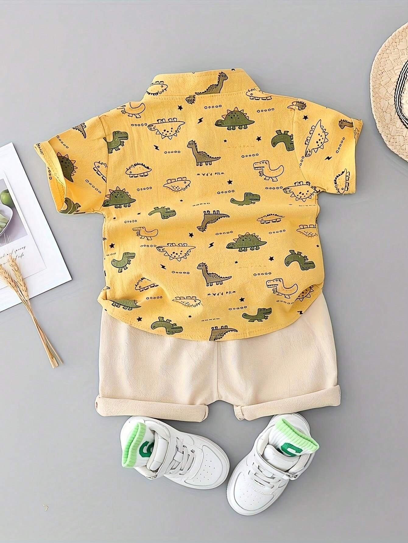 El Conjunto amarillo dinosaurios manga es la opción perfecta para quienes buscan una prenda fresca, cómoda y con un diseño divertido para los días cálidos. Este set de dos piezas incluye una camisa de manga corta con cuello alzado y botones delanteros, acompañada de shorts en tono beige que complementan perfectamente el estampado principal.