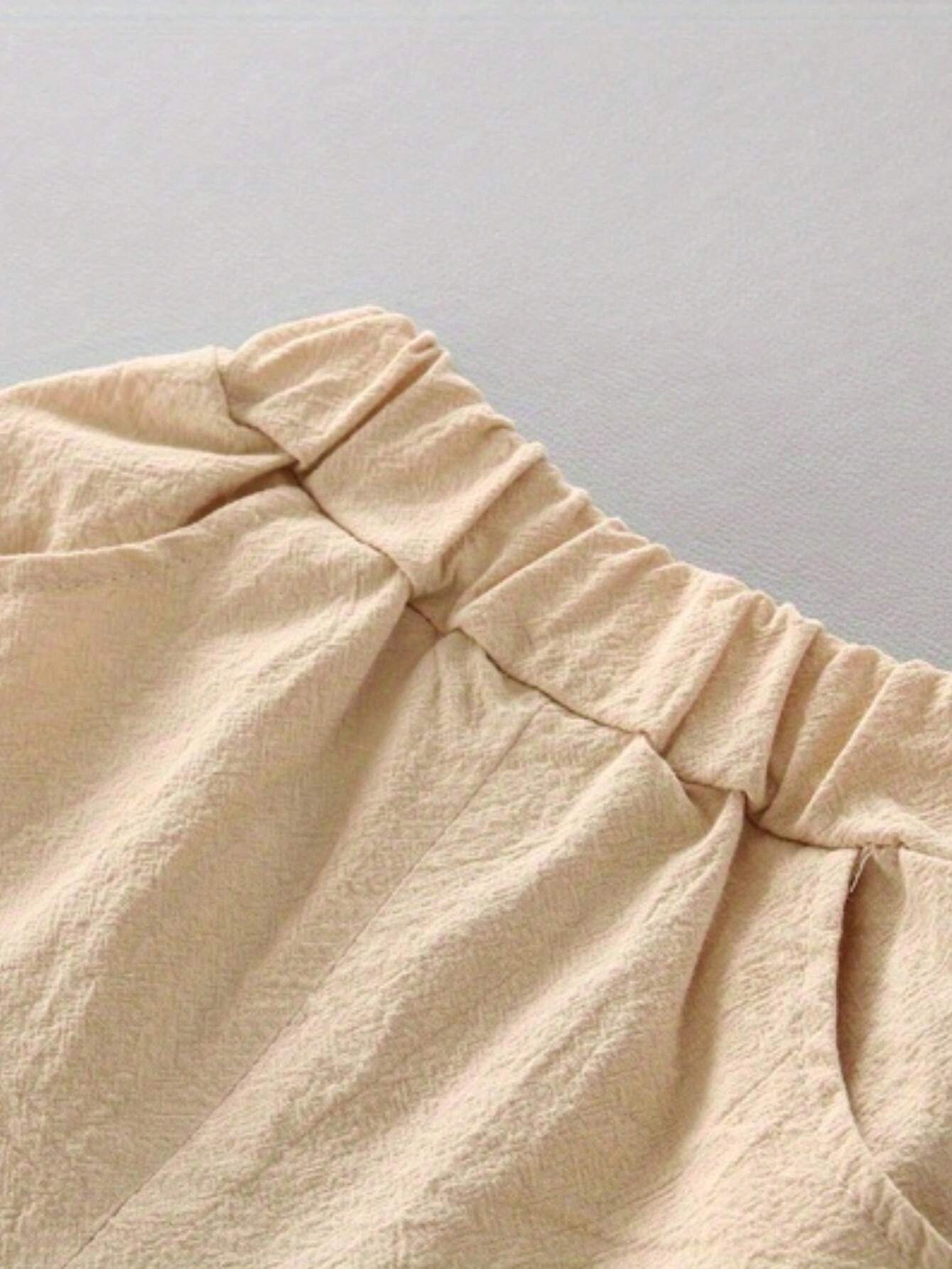 El Conjunto amarillo dinosaurios manga está diseñado pensando en la comodidad. La camisa cuenta con botón delantero funcional y bolsillo decorativo, además de un cuello alzado que aporta un estilo ligeramente más formal sin perder su esencia casual. Por su parte, el short beige posee cintura elástica que facilita el ajuste y brinda mayor comodidad al vestir.