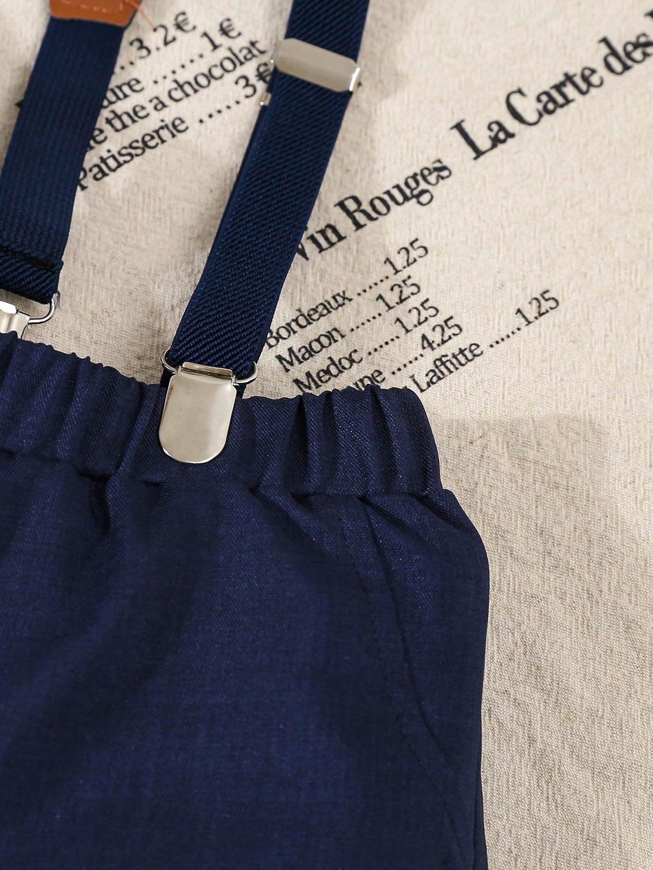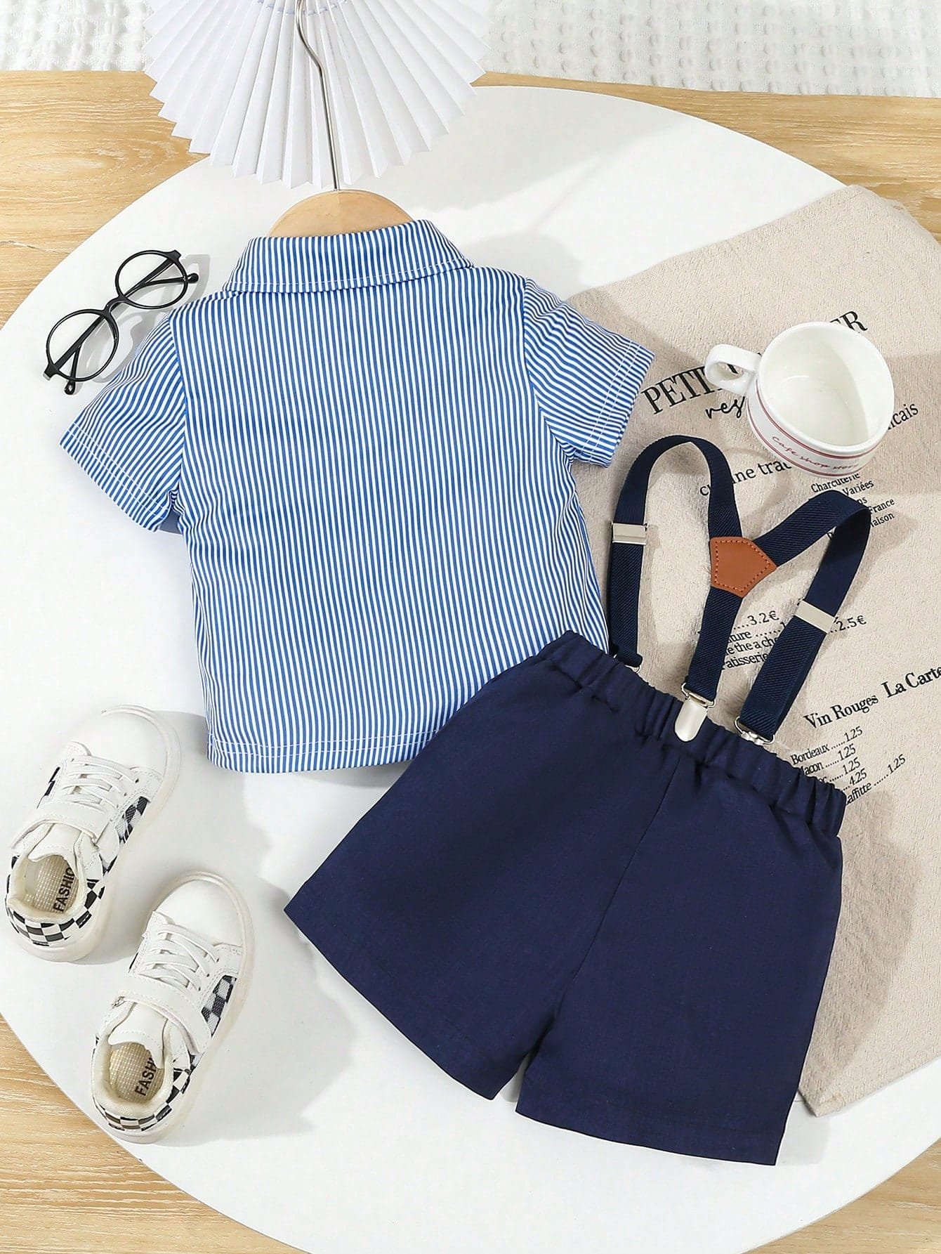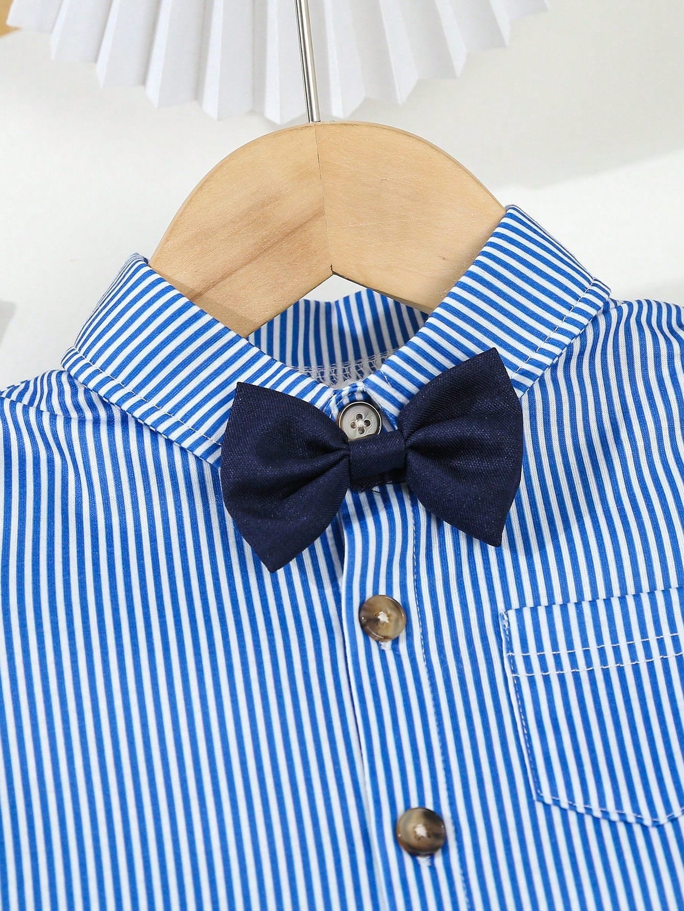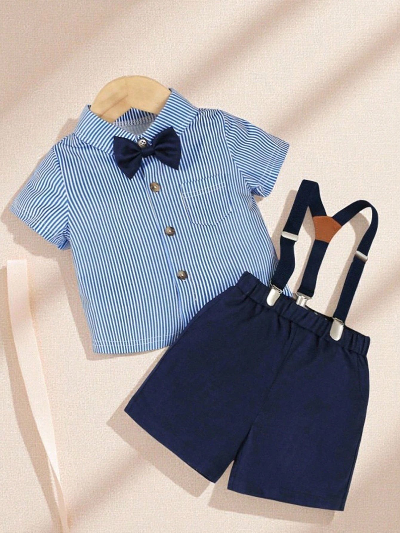 El conjunto azul a rayas es una opción elegante y moderna para vestir a tu pequeño en ocasiones especiales durante el verano. Este set de 2 piezas combina una camisa de manga corta con estampado de rayas verticales en azul y blanco, acompañada de una pajarita azul marino que añade un aire distinguido y encantador. El look se completa con unos shorts de color sólido azul marino, cómodos y frescos, que además incluyen tirantes ajustables para darle un estilo vintage británico único.