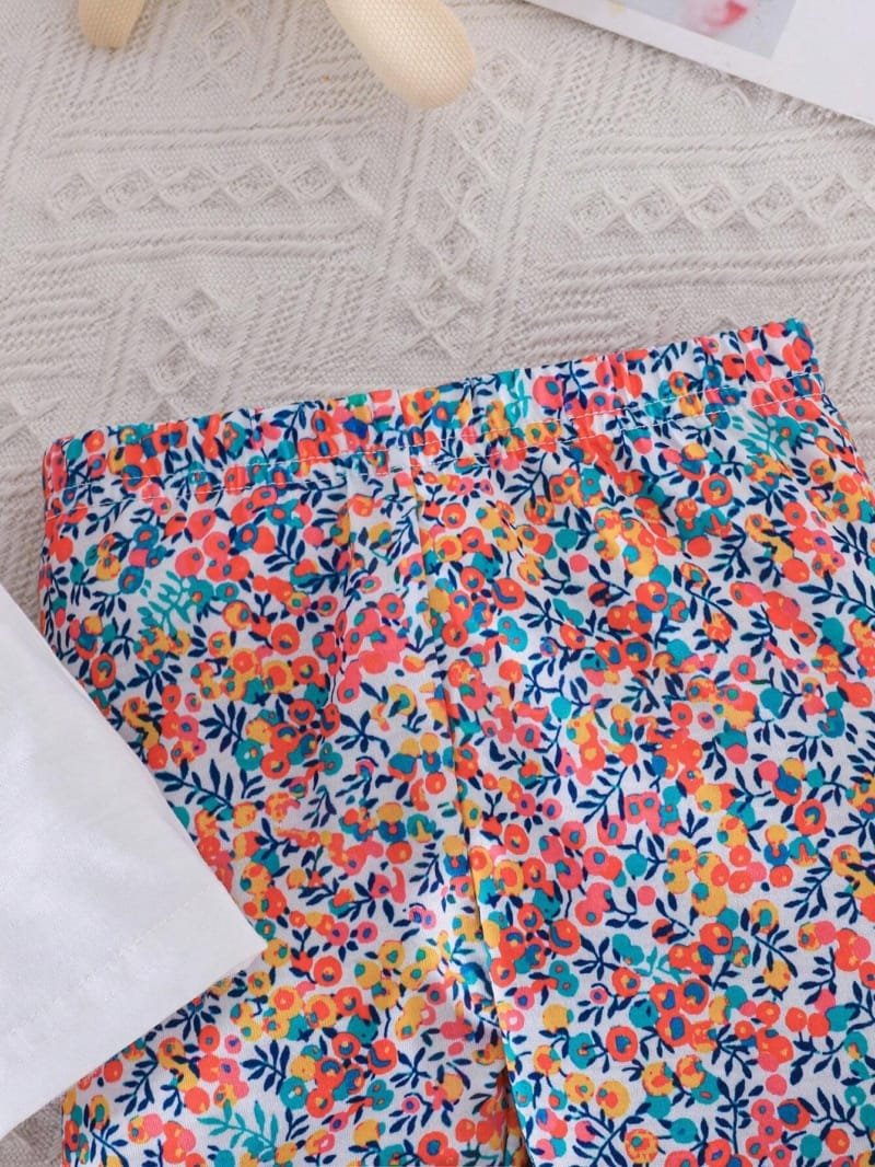 La parte superior es una camiseta blanca sin mangas, confeccionada en tela tricotada suave, con un encantador estampado de conejo con lazo floral. Sus mangas con volante le dan un toque femenino y divertido, mientras que el cuello redondo aporta comodidad y facilidad al momento de vestir. La tela ligera y elástica (95% poliéster, 5% elastano) permite un ajuste cómodo y flexible para que tu bebé se sienta libre de moverse y jugar sin restricciones.