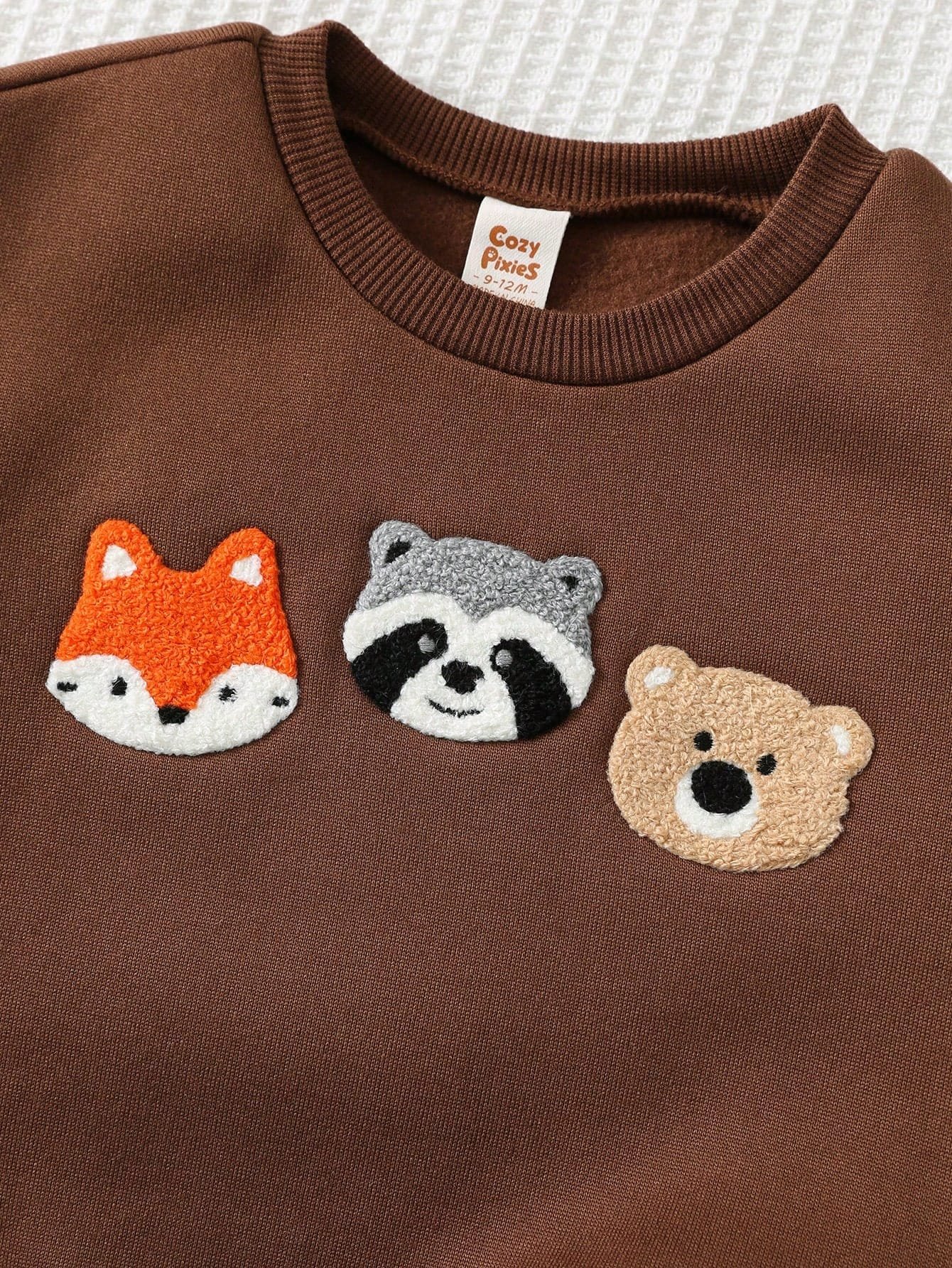 La sudadera de manga larga en tono café presenta un diseño de animalitos bordados tipo dibujos animados en la parte frontal, incluyendo figuras tiernas que aportan un estilo divertido y acogedor. El cuello redondo ofrece un ajuste cómodo y fácil de colocar, mientras que el corte suelto permite libertad de movimiento durante el juego o las actividades cotidianas. Sus mangas combinadas en distintos colores añaden un toque moderno y original al diseño. Además, cuenta con forro interno de pelito suave, proporcionando una sensación cálida y agradable, ideal para climas frescos.