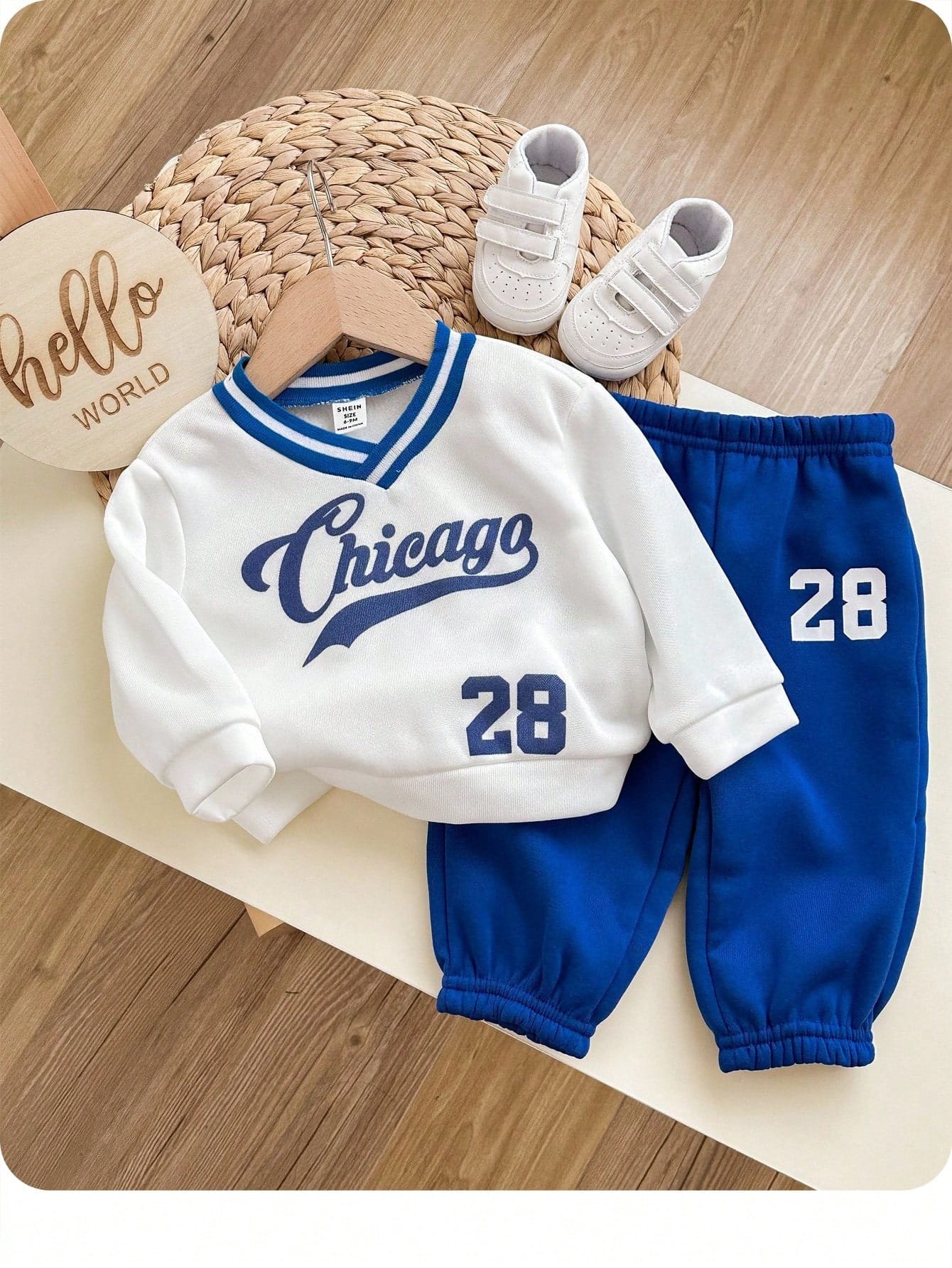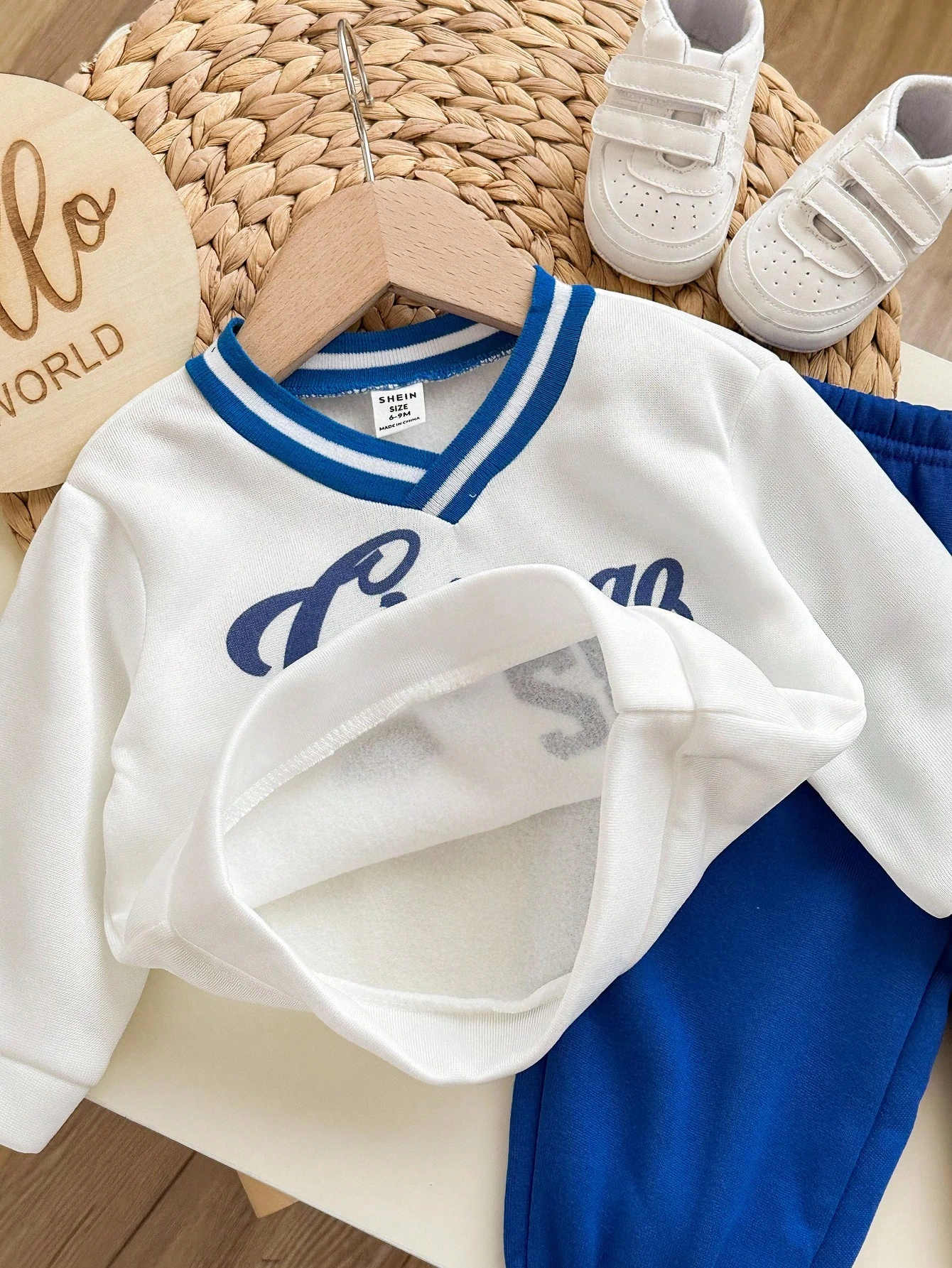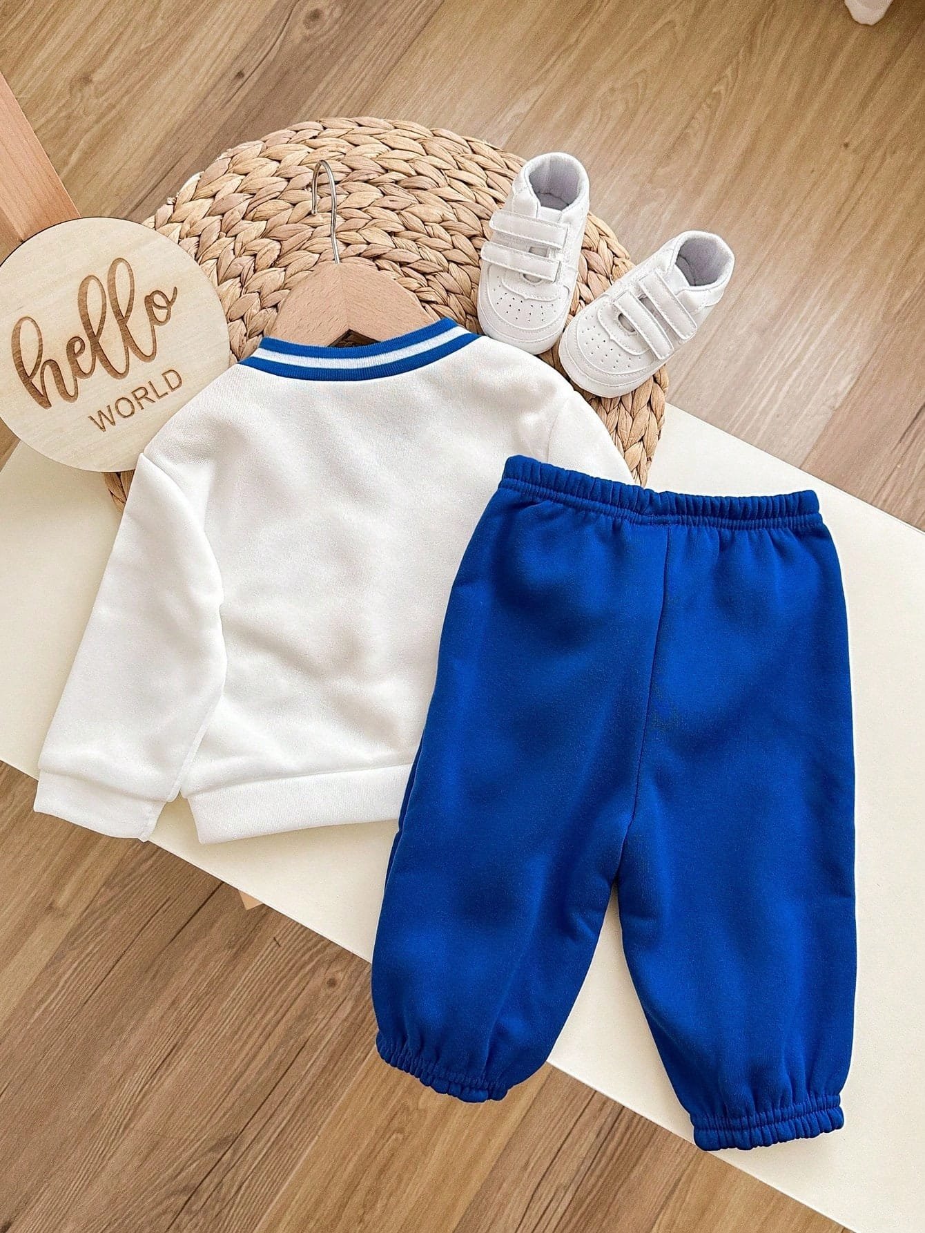 El Conjunto deportivo azul y blanco destaca por su estampado gráfico con letras y número decorativo, aportando un estilo juvenil y actual. El contraste entre el blanco de la sudadera y el azul intenso del pantalón crea una combinación equilibrada, fácil de combinar con calzado deportivo o accesorios casuales. Además, el cuello en V con ribetes a contraste añade un toque moderno y deportivo que realza el diseño.