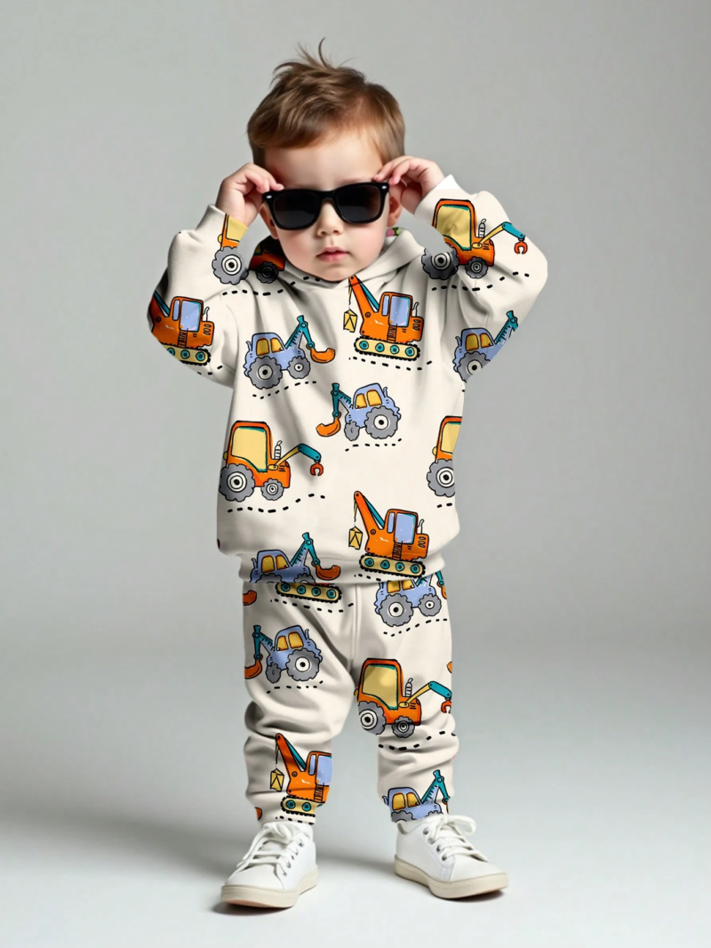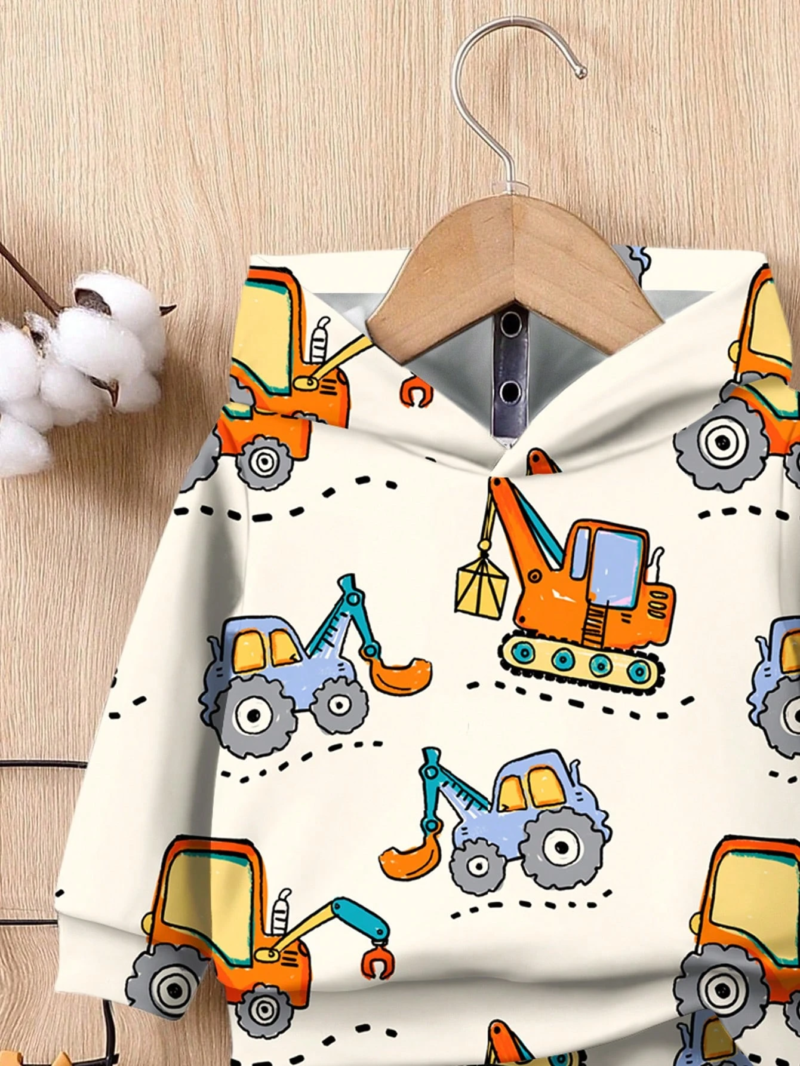 La sudadera de manga larga presenta un divertido gráfico de bulldózer, combinando un diseño moderno con un toque infantil. Confeccionada en tela tricotada de 100% poliéster, ofrece suavidad y comodidad para el uso diario. Además, cuenta con un práctico bolsillo y botones delanteros que facilitan el vestir y añaden un detalle encantador.