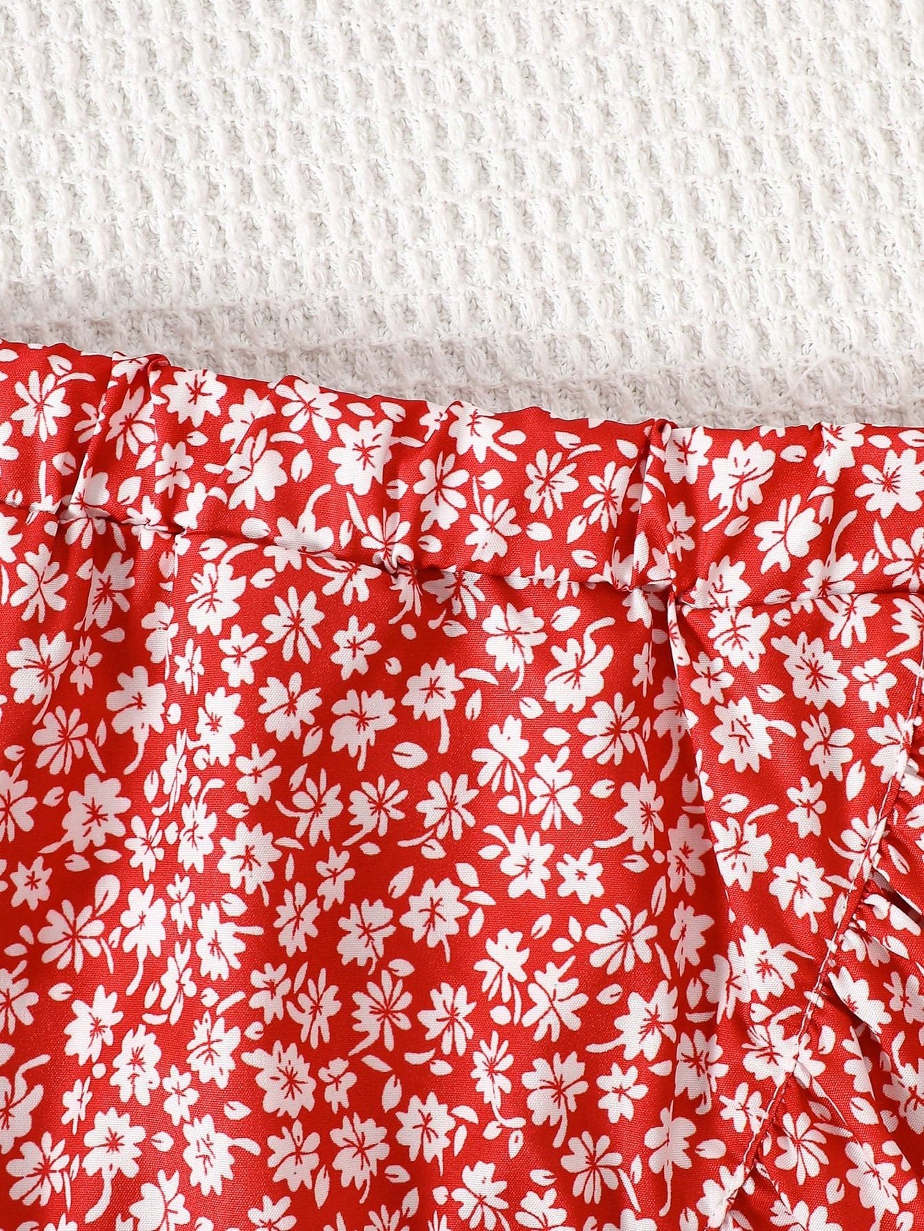 El Conjunto rojo floral volantes destaca por su hermoso estampado de pequeñas flores blancas sobre fondo rojo intenso, un contraste clásico que transmite alegría y estilo. La blusa presenta un diseño ajustado con efecto fruncido en el torso, lo que permite un ajuste cómodo gracias a su estiramiento medio. Sus mangas con volantes amplios aportan volumen y un toque romántico que realza el diseño.