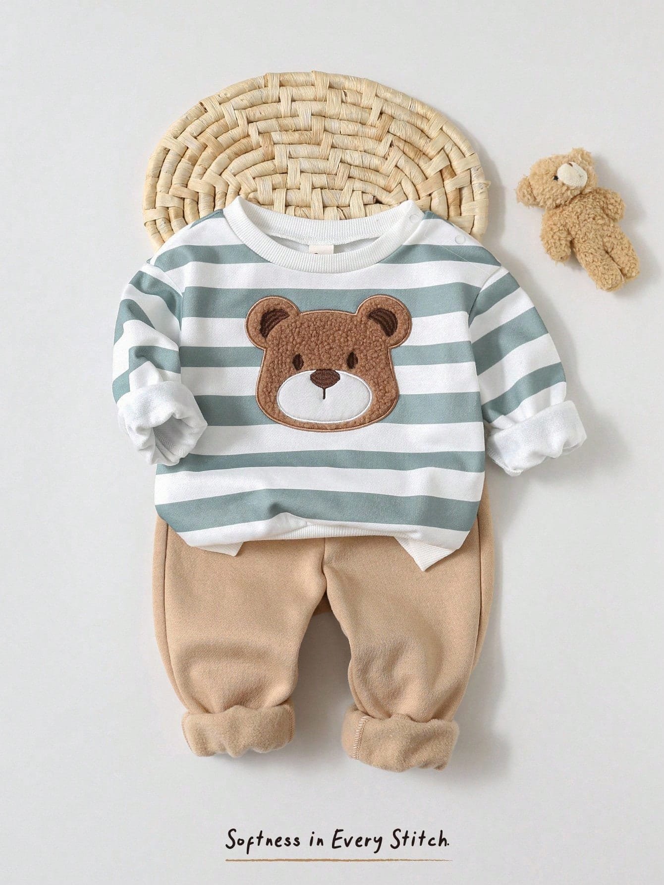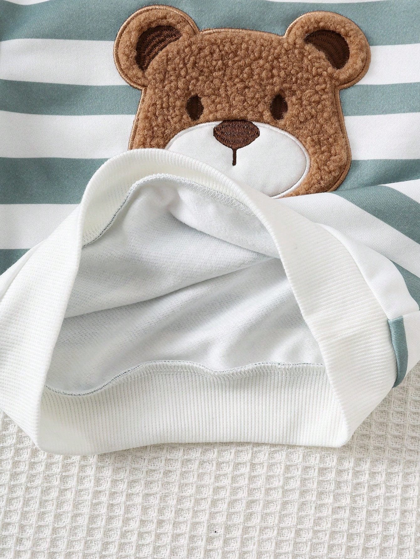 La sudadera de manga larga presenta un cuello redondo clásico y un interior forrado térmico que ayuda a conservar el calor corporal sin resultar pesada. Su tejido es suave al tacto y cuenta con una elasticidad ligera, lo que permite un ajuste cómodo y natural. El gráfico de oso aporta un detalle visual tierno y atractivo, mientras que el diseño a rayas en tonos verdes y blancos añade un toque moderno y armonioso al conjunto.