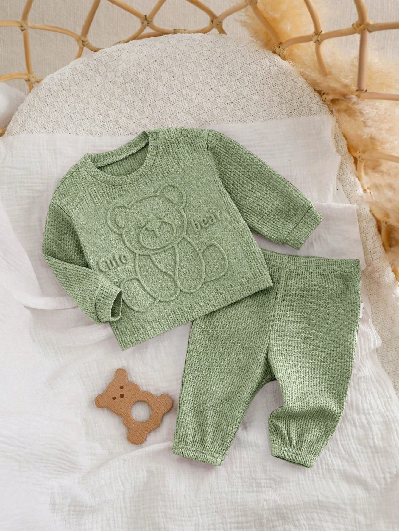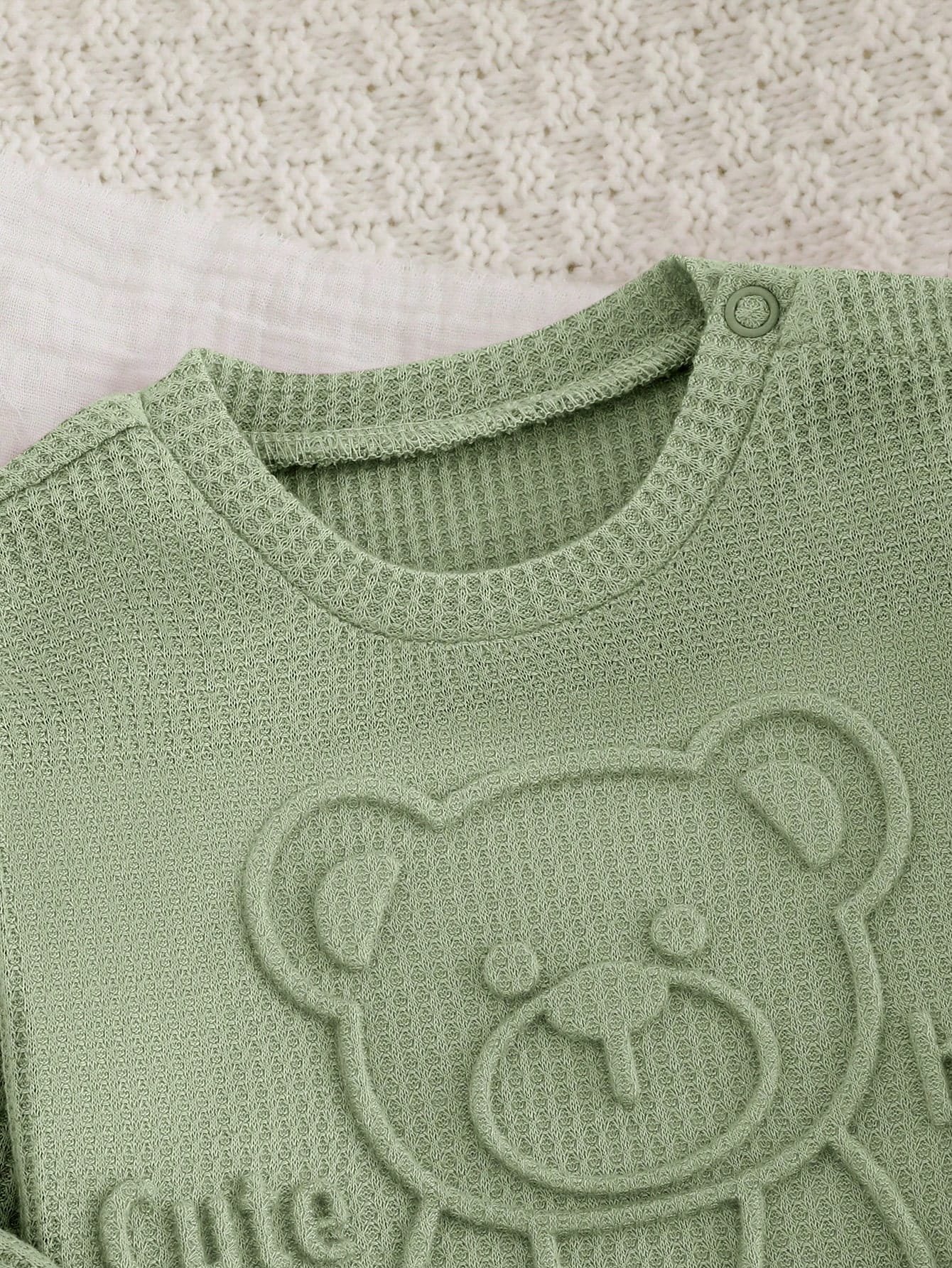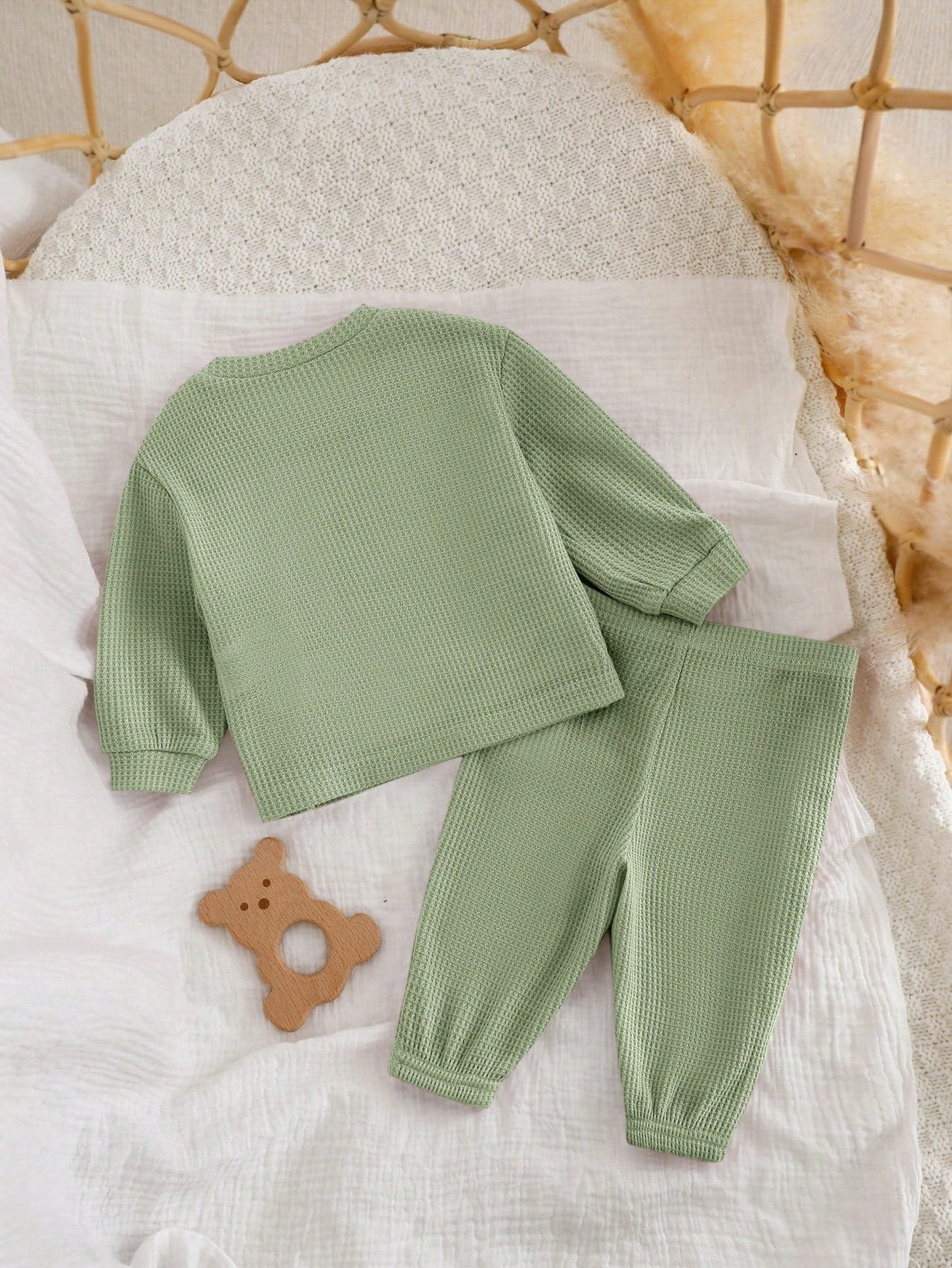 El color verde suave transmite calma y naturalidad, convirtiendo este conjunto en una opción fácil de combinar con otros accesorios como gorritos, mantas o zapatitos. Su estilo dulce y minimalista lo hace perfecto tanto para el día a día como para ocasiones especiales donde se busca comodidad sin perder estética.