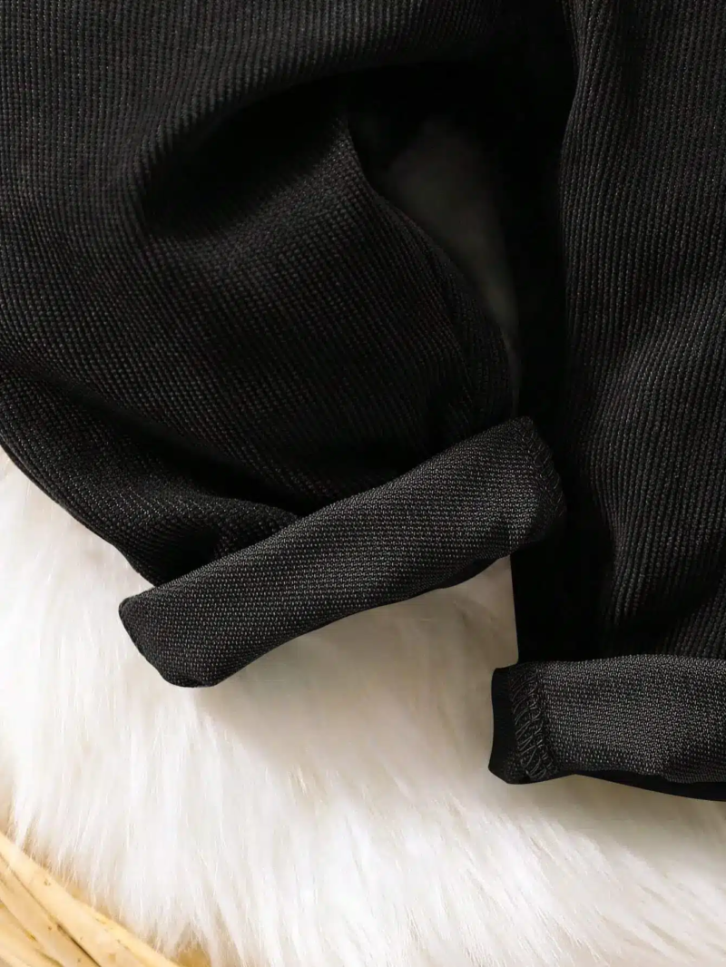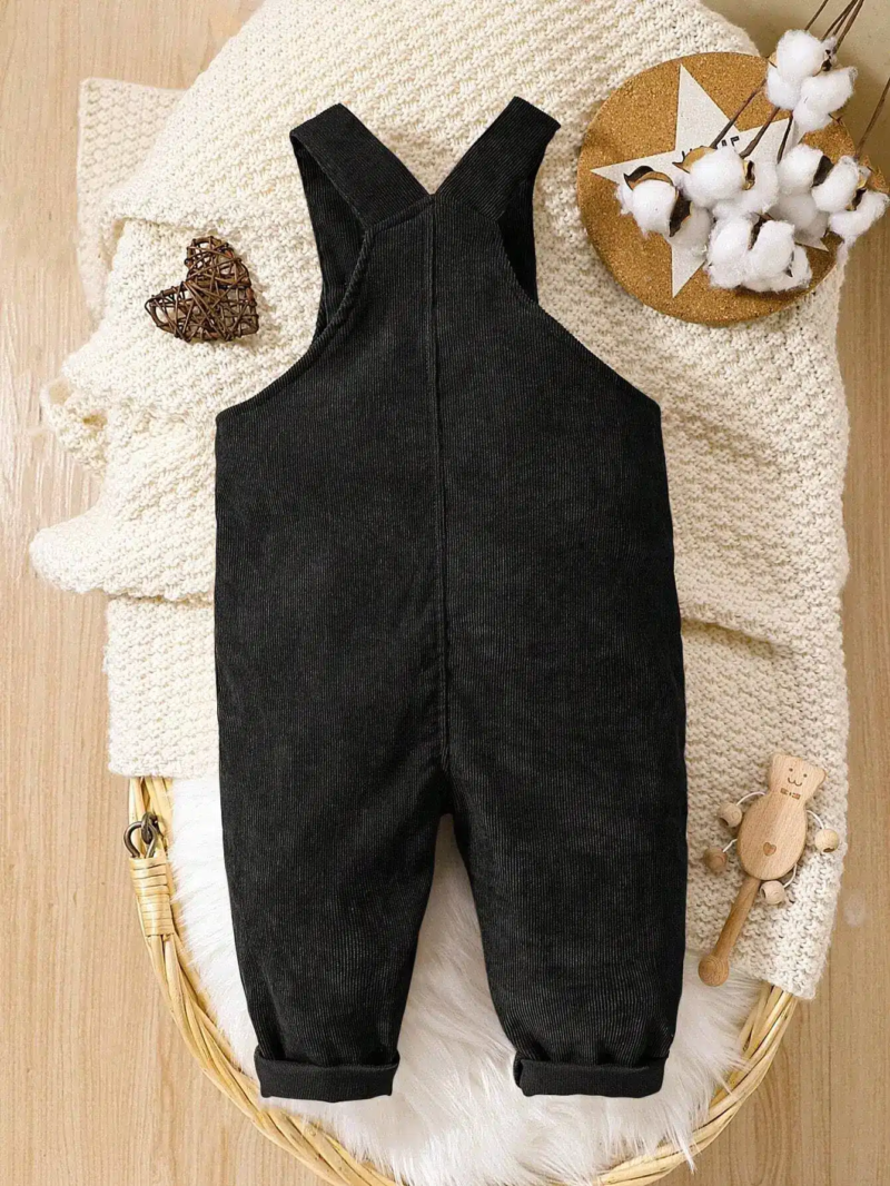 Fabricado con una mezcla de 97% poliéster y 3% elastano, este overol tiene una textura suave y agradable al tacto. Aunque el tejido no es elástico, su corte y confección permiten un ajuste cómodo sin limitar los movimientos del bebé. Su color negro clásico facilita la combinación con camisetas de colores vivos o tonos neutros, adaptándose a cualquier estilo.