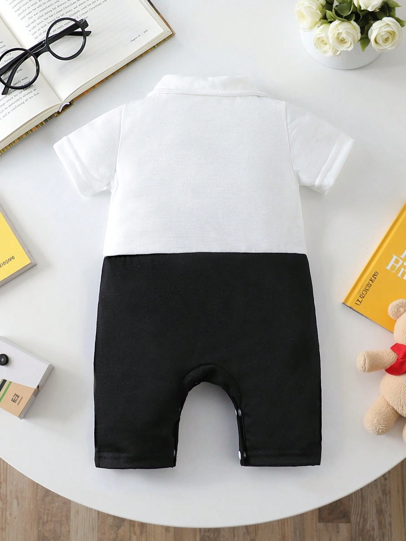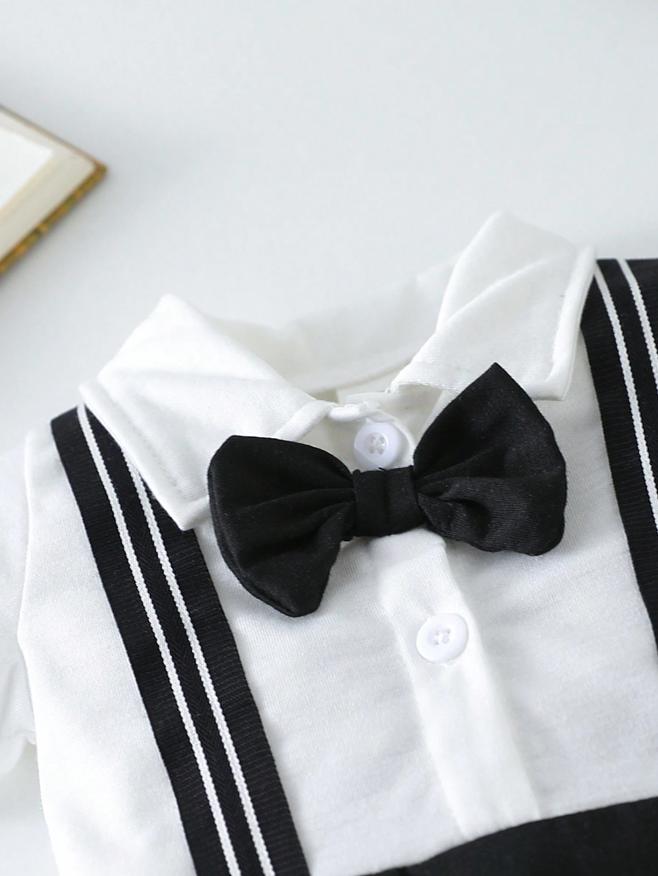 El Pelele blanco negro moño incorpora un cuello camisero clásico, botones delanteros funcionales y un delicado moño negro que aporta el toque distintivo y elegante. Los tirantes decorativos en contraste refuerzan su estética formal y minimalista, ideal para ocasiones especiales, sesiones fotográficas o eventos familiares donde se desea un atuendo impecable.