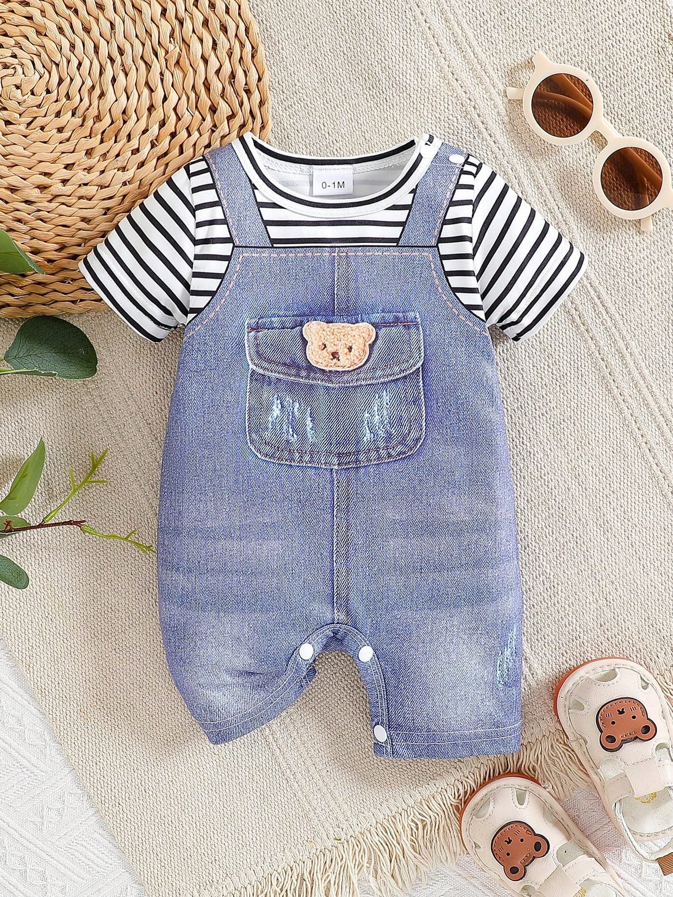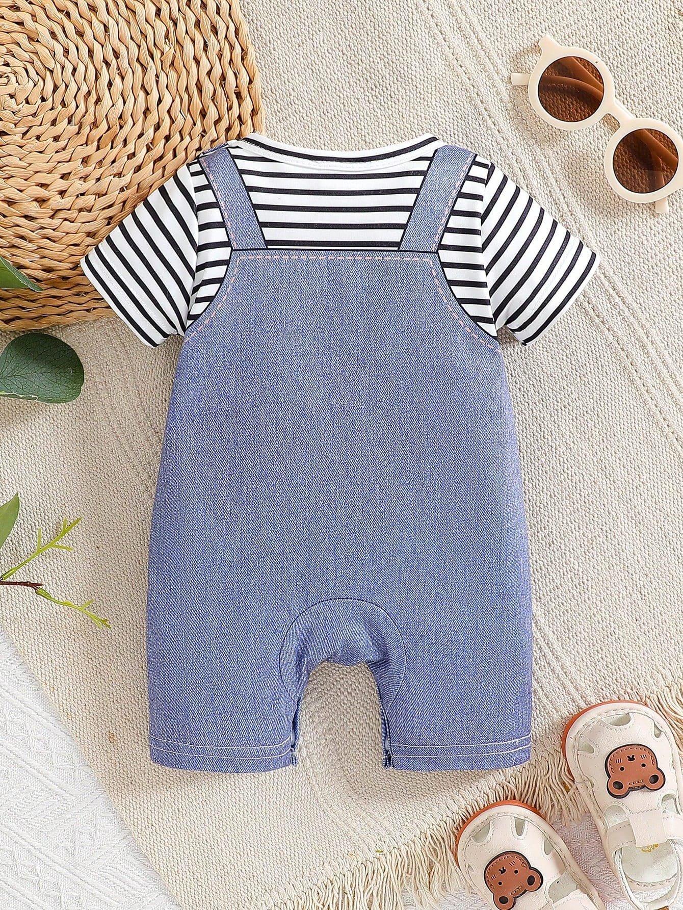 Este modelo destaca por su confección en tela ligera de alta calidad, compuesta por 95% poliéster y 5% elastano, lo que proporciona suavidad al tacto y un elástico ligero que permite libertad de movimiento. Su cuello redondo y mangas cortas lo hacen perfecto para mantener la frescura en climas cálidos, mientras que el diseño de tirantes tipo peto en denim impreso aporta un look moderno y casual, simulando un overol con camiseta de rayas en blanco y negro.