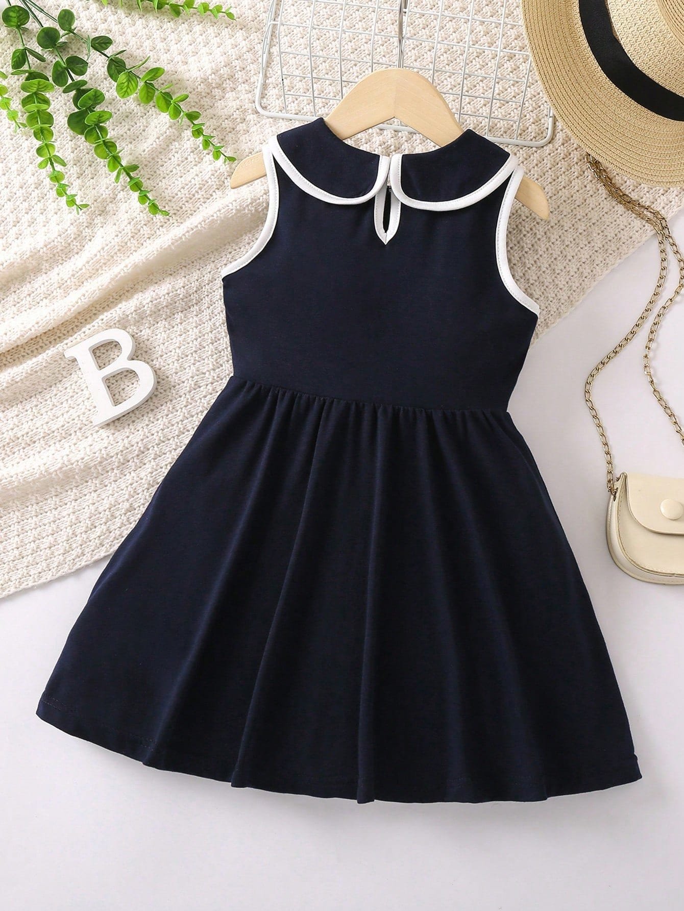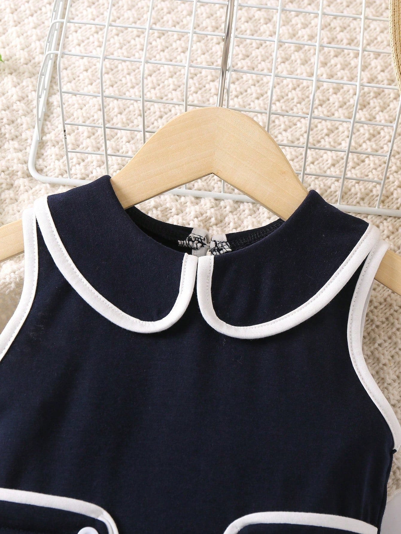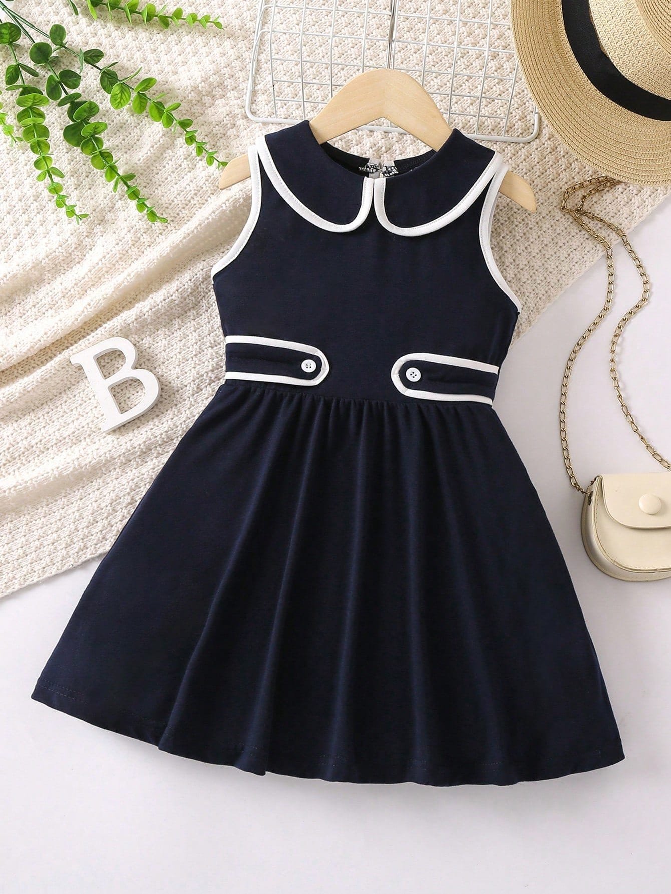 Su diseño sin mangas lo convierte en una opción ideal para la temporada de primavera y verano, pero también puede combinarse con un suéter ligero en días más frescos. El cuello tipo peter pan con borde contrastante en blanco aporta un aire clásico y refinado, mientras que los detalles de botones decorativos en la cintura realzan el estilo, marcando la silueta con un toque delicado y encantador.