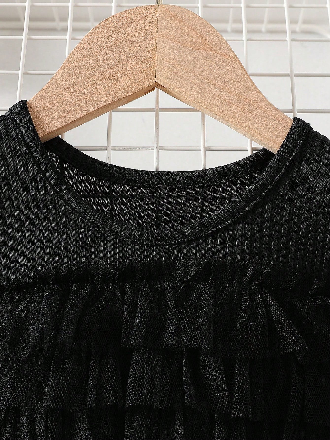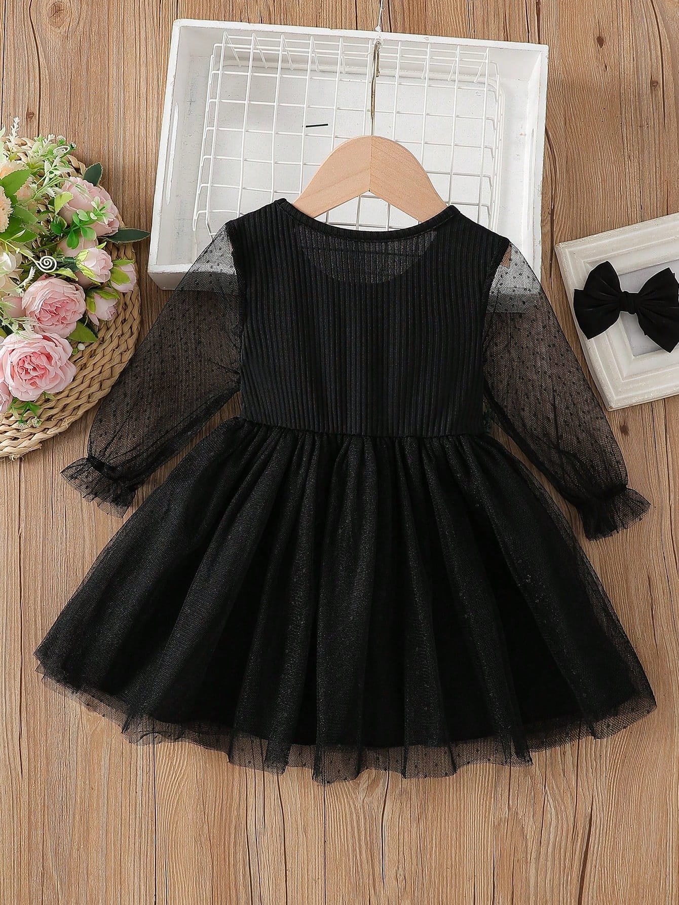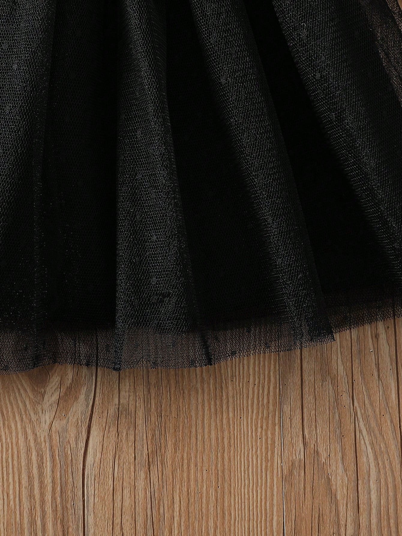 Uno de los elementos más distintivos del Vestido elegante negro tul son sus mangas largas confeccionadas en malla transparente con sutiles lunares, que aportan un contraste delicado con el cuerpo liso del vestido. Estas mangas cuentan con puños suaves que se ajustan sin apretar, brindando un acabado refinado y cómodo. En la parte superior, los volantes de malla en el pecho añaden un detalle dulce y moderno, elevando el diseño general de la prenda.