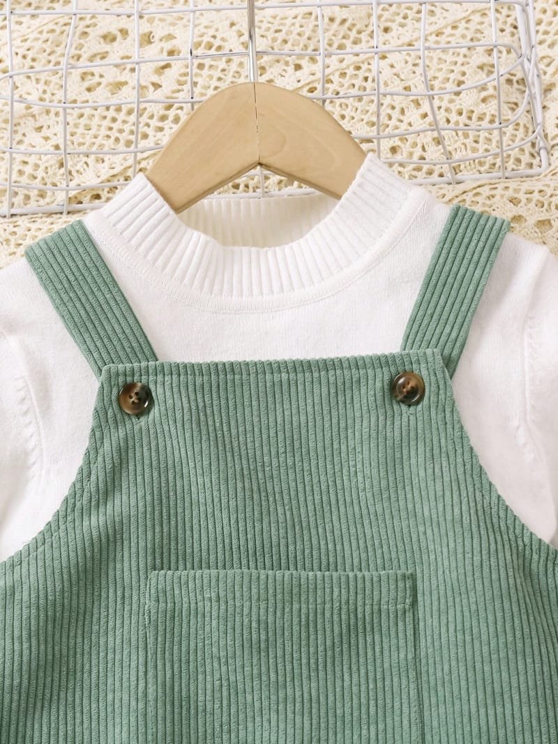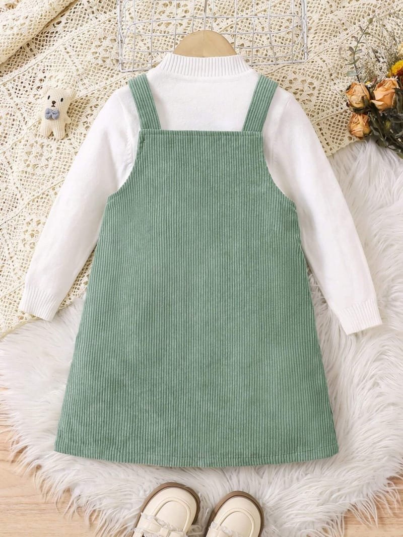 El vestido verde con bordado es una prenda encantadora, cómoda y práctica que combina perfectamente con el estilo diario de las niñas. Este vestido tipo peto está diseñado para usarse en otoño e invierno, ya que su tela gruesa tipo pana proporciona un toque cálido y suave al tacto, ideal para los días más frescos.